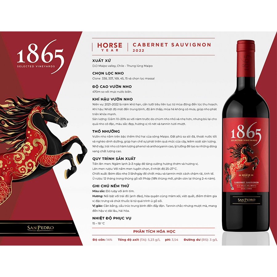 Rượu Vang Đỏ Chile 1865 Horse Year 2026 là ấn phẩm đặc biệt đến từ thương hiệu San Pedro, một trong những nhà sản xuất rượu vang hàng đầu Chile. Phiên bản giới hạn này không chỉ ghi dấu bằng chất lượng đỉnh cao của giống nho Cabernet Sauvignon, mà còn nổi bật với thiết kế nhãn chai mang biểu tượng “Ngựa tung vó”, tượng trưng cho sức mạnh, sự kiêu hãnh và khát vọng vươn xa – tinh thần mà nhà San Pedro muốn gửi gắm đến người thưởng thức trên toàn thế giới.