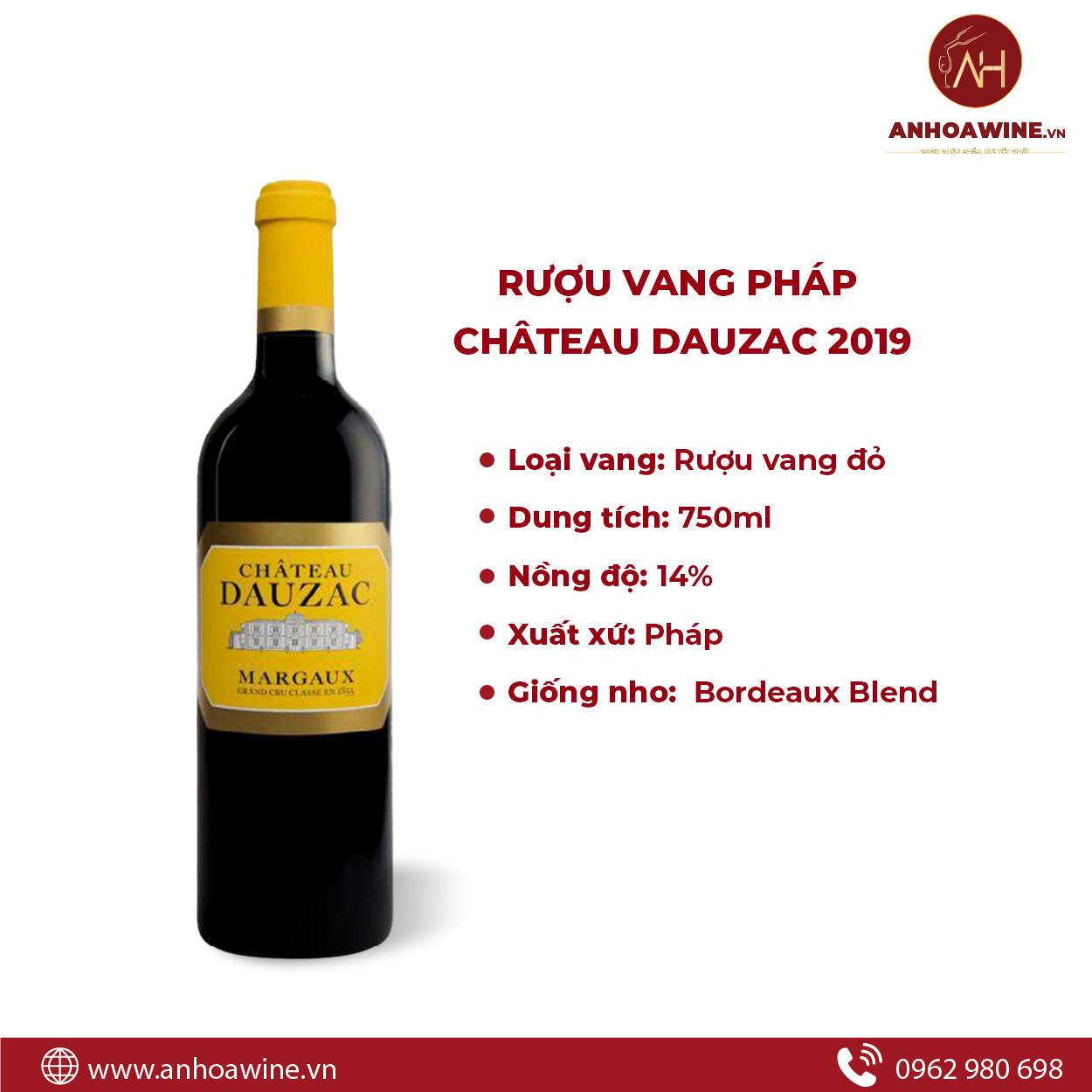 Château Dauzac Grand Cru Classé 2019 là một trong những chai vang đỏ tiêu biểu của vùng Margaux – Bordeaux, thuộc phân hạng danh giá Grand Cru Classé 1855. Sở hữu hương vị tinh tế, cấu trúc cân bằng và thiết kế sang trọng, đây là dòng vang Pháp thượng hạng dành cho những tín đồ sành vang và những bữa tiệc đẳng cấp.